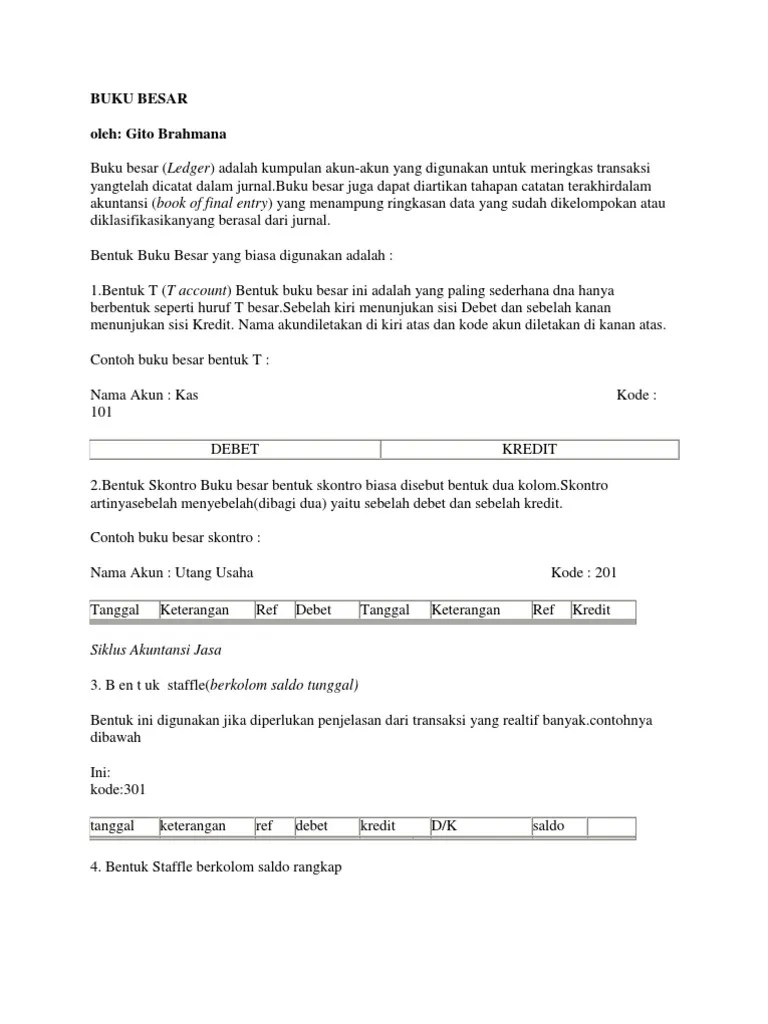 Mulai dari pengertian, fungsi, bentuk buku besar, cara posting dari jurnal. Bentuk buku besar meliputi bentuk skontro dan bentuk stafel. Kamu yang sudah sering membuat laporan keuangan, laporan neraca dalam bentuk buku skontro atau buku stafel, atau mempelajari akuntasi? Berdasarkan bentuknya buku besar dibagi menjadi 4 jenis, yaitu buku besar berbentuk t (sederhana), bentuk skontro, . Skontro sendiri artinya adalah sebelah atau dibagi dua yaitu kanan dan kiri atau debet dan .